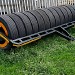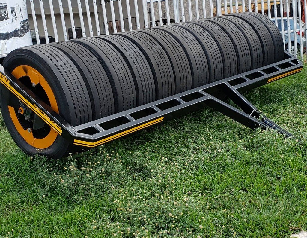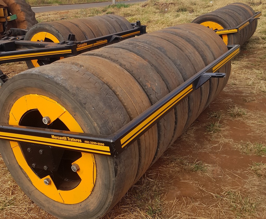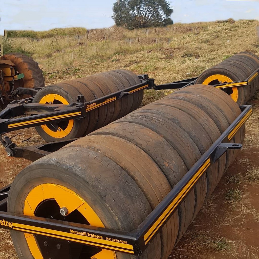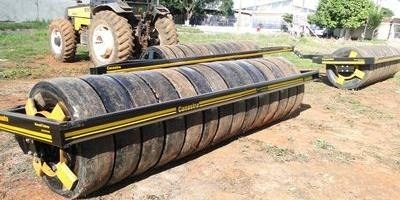 Única operação distribui semente a lanço (com distribuidor montado no hidráulico de três pontos do trator) e ao mesmo tempo, arrasta o rolo compactador no rabicho do trator, desviando a semente para o solo na frente do rolo, permitindo uma perfeita semeadura e boa compactação.